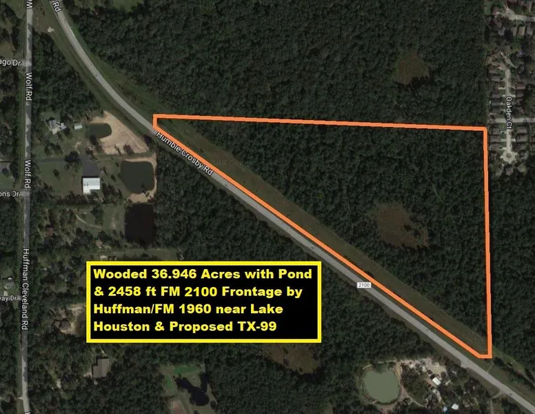 Wooded 36.946 Acres with Pond & 2458 ft FM 2100 Frontage by Huffman/FM 1960 near Lake Houston & Proposed TX-99/The Grand Parkway. Tract 1 is a Triangle on the NE side of FM 2100 which is Part of 63.364 Acres that has been divided into two tracts by FM 2100. Not Included in Sale is Tract 2 - 26.418 Acres which is located on SW side of FM 2100. Tract 2 is also available for sale either separately or combined with Tract 1. Nestled between The Commons of Lake Houston (Lakefront Community w/850 Homes) & Fairway Crossings of Lake Houston (Golf Resort Community w/226 Homes). Outside City Limits but within Extraterritorial jurisdiction of the City of Houston. Outside Flood Plain. Property is only 19 Miles to Bush Intercontinental Airport & 35 Miles to Downtown Houston. Can Be Commercial or Residential. Survey in Docs but Buyer May Need to Purchase New Survey! Minerals are Negotiable! Huffman ISD received TX Education Agencys Award of Excellence for its gifted student & special education programs. Call for Available Utilities!