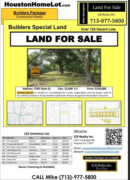 Builders Special! on 15,660 S. F, Re-palatable for 6 units single family and one duplex with all city utilities available in Trinity Gardens subdivision , only 3 blocks from Hwy 69 N. please call the agent for builders discount.