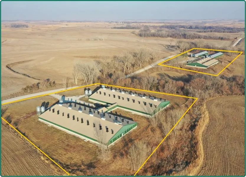 There are 3 - 2,400 head wean-to-finish hog barns built in 2008, remodeled in 2015. Each barn is 100 x 190 with 8 pit under each barn, wood-framed w/ poured concrete stem, fully insulated walls, and enclosed, heated 8 hallway/loadout.
