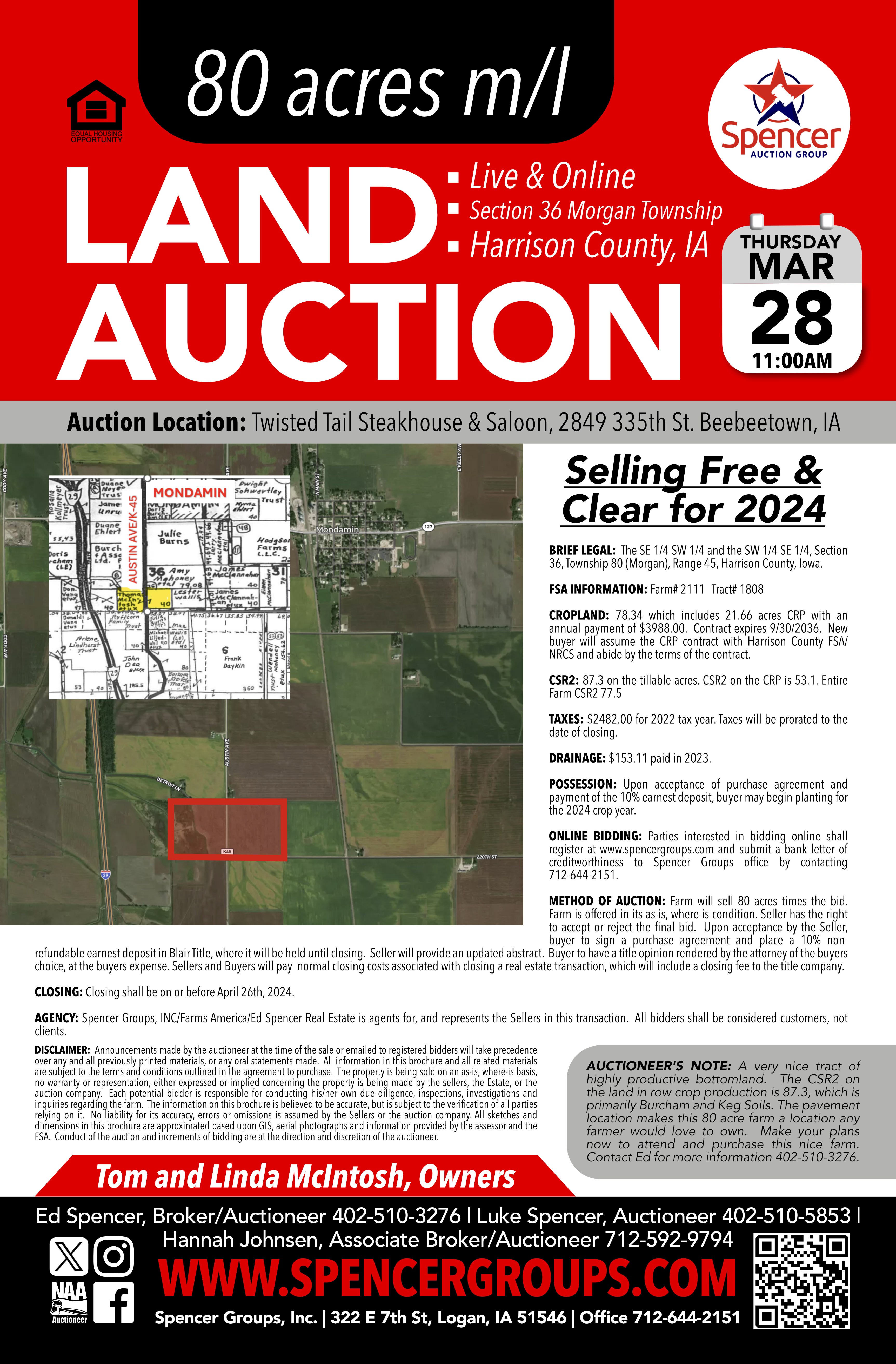 Brief Legal: The SE 1/4 SW 1/4 and the SW 1/4 SE 1/4, Section 36, Township 80 (Morgan), Range 45, Harrison County, Iowa.
