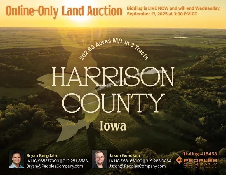 Mark your calendars for Wednesday, September 17th, 2025! Peoples Company is pleased to represent the sale of 202.63 acres m/l in the heart of Iowas scenic Loess Hills. Located in Harrison County, just northeast of the Interstate 880 and Interstate 29 interchange, these three distinct tracts offer a unique blend of mature timber, open pasture, and rural homesteadsall within 30 minutes of the Omaha Metro.