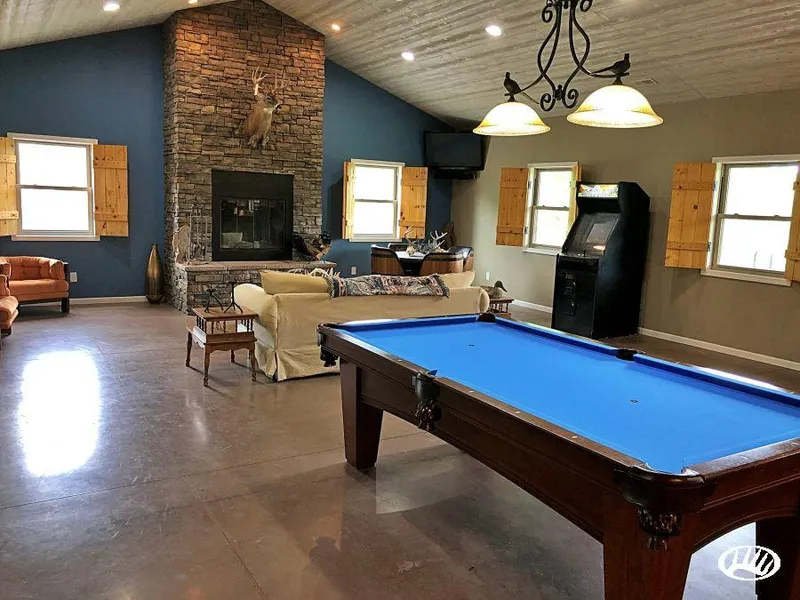 - 52x8 Covered Porch has recessed lighting, and a concrete shooting bench, all overlooking the stocked pond, fire pit, and picnic area