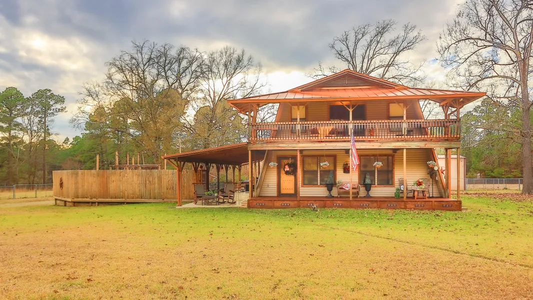 ELYSIAN FIELDS ISD. Over 15 acres. Remodeled 3/2.5 with main bedroom down stairs. Large family room upstairs. 2 bedroom / bath and deck that goes all across front. Lots of room to roam with this one. Beautiful fenced land with 2 ponds, hay barn shop and storage buildings. Only one neighbor with in view of the house. Enjoy balconies for leisure and watching the deer.