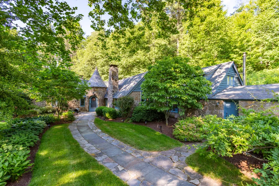 Introducing a gorgeous secluded retreat 2 hours from NYC. "Morgan castle", built in 1942, is situated on 2 acres of lush landscaped gardens and is accompanied by a three season guest house! The 2 bedroom, 2 bath stone house features phenomenal architectural detail, open space living, and a recently updated master bedroom suite. The kitchen has stainless steel appliances, granite countertops, and opens to an expansive living and dining area with vaulted wood beamed ceilings and large stone fireplace. A main-level master suite features chic styling, its own wood burning fireplace, and gorgeous bath. A private second bedroom and bath sit elevated from the main living spaces and features a loft seating area. Directly off the kitchen space sits an English garden patio for private enjoyment of fresh air and blue sky. This unique home is complete with a 1000 bottle wine cellar. Accompanying the main house is a three-season, two-story guest house with heating, central air, and full bath. The two are tied together by a heated in-ground pool, outdoor shower, patio with sitting area, gardens, koi pond, fire pit and manicured trees; all creating an exceptional retreat experience where one can escape the day to day and breathe it all in. Located near great fishing & kayaking on the Farmington River, hiking, biking, skiing, golf and just 2 hours by car from both NYC and Boston, and just 30 Min to Hartford and BDL International Airport. Floor plans available upon request.