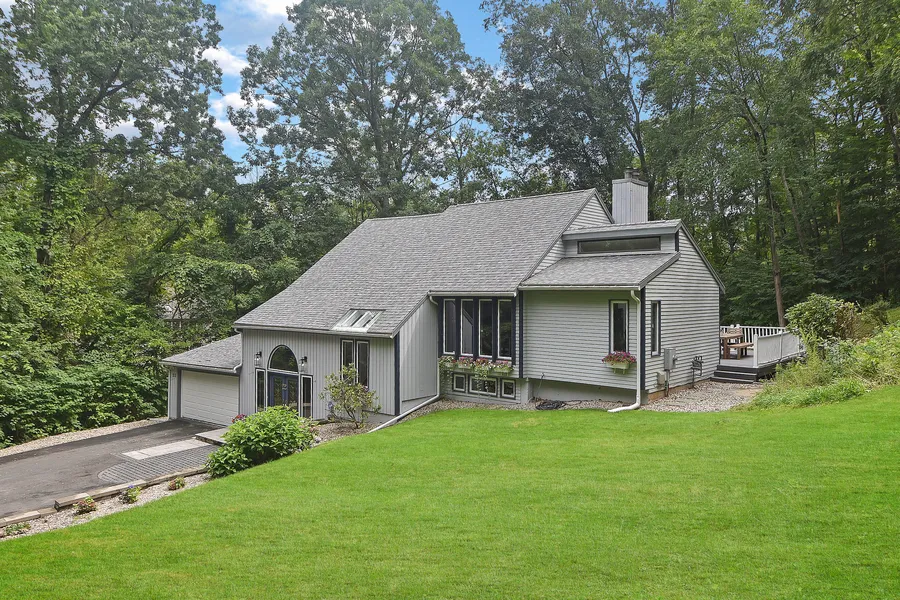 Live in Farmington and enjoy all the best of West Hartford! This beautiful Contemporary home which is conveniently located on the Farmington/ West Hartford line is set on a private lot and offers an abundance of natural light and an amazing open floor plan. Cathedral ceilings and skylights in the Living Room, Dining room and Kitchen. Hardwood Floors on the main level. The kitchen offers cherry cabinets, granite counters, SS appliances, a large pantry and sliding doors to an oversized Trex deck overlooking the most private backyard. There are 2 generous size bedrooms on the main level, one of which is a suite, another large bedroom on the lower level with sliding doors to another large Trex deck while the upper level hosts a Master suite ideal for privacy. The cozy fireplaced family room on the lower level with newly installed carpeting has french doors to a beautiful stone patio. New lighting fixtures throughout, newly painted interior throughout, new roof and garage doors in 2019, newer mechanicals. Sellers ordered all new interior doors but are waiting for delivery.