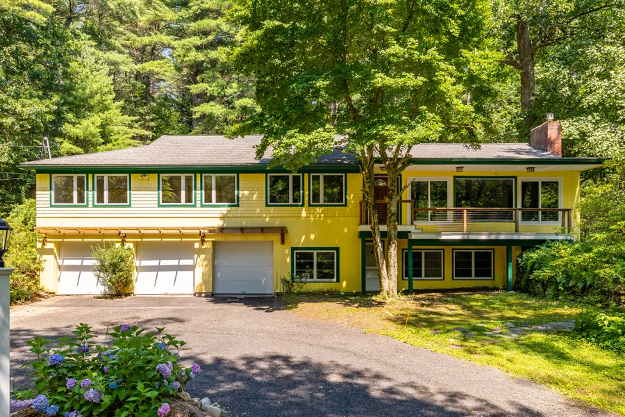 Welcome to a private oasis located in desirable West Simsbury, CT. Situated on a cul-de-sac, the over three-acre property is a park-like setting. Enjoy relaxing on a stylish deck while taking in the lush surroundings of flowering trees, tranquil pond, and the sounds of a flowing brook. A solid wood entry door reveals newly refinished hardwood floors, brick fireplace, and splashes of solid wood paneling and built-in bookshelf. This fabulous home with a Mid-Century vibe is rich in character and lends itself to a variety of dcor options for you to realize your own vision. The large living and dining rooms offer large picture windows in front and glass slider out to the very private stone patio. A spacious kitchen is home to a laundry closet, wall oven, cook-top with hood, plenty of cabinet and counter space, and glass slider. The primary bedroom suite features a walk-out to a private hot tu...