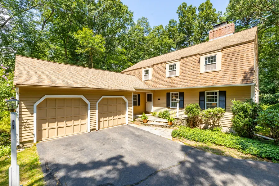 Welcome home to this enchanting Gambrel Colonial nestled within the sought-after Fox Den neighborhood in Simsbury, CT. Tucked away at the rear of a 1-acre+ lot, the home offers both privacy and connection to nature with trails accessible right from the backyard. The sun-drenched deck is seamlessly connected to the mud room and family room, creating an effortless indoor-outdoor flow. The heart of the home is a spacious, sunlit kitchen and family room, while elegance meets function in the formal living room, boasting generous dimensions, fireplace, and a built-in bookcase. The formal dining room exudes timeless charm and features convenient built-in cabinetry. Convenience and comfort blend seamlessly on the ground level, with an attached garage, a mud room, a half bath, and a dedicated laundry room. The upper-level features hardwood flooring through the entirety of the space. Four bedrooms await, including the primary bedroom, complete with an ensuite bathroom. An additional hall bath caters to the needs of family and guests alike. Located near Simsbury High School and Simsbury Farms municipal recreation facility, the home captures the essence of community and convenience. Simsbury's reputation as one of New England's best places to live is well-earned, with abundant recreational opportunities and a vibrant array of community activities. Just 2 hours away from both New York City and Boston, this home combines suburban living with accessibility to major metropolitan centers.
