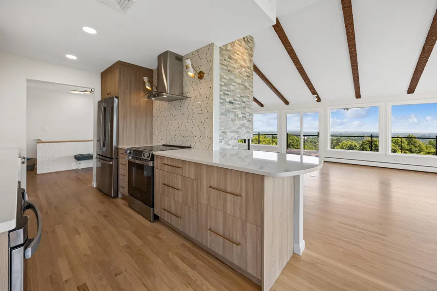 Welcome to 124 Ferncliff Drive where every day starts and ends with jaw-dropping Hartford skyline views. Over 2,300 square feet (including the partially finished lower level) of light-filled, view-drenched living, designed for people who want more than just a house, they want a statement. Oversized windows on every level frame the city like a moving piece of art. Upstairs, vaulted ceilings soar over a chic living room with a fireplace that begs for evenings in. The dining area flows into an updated kitchen, the kind of space that makes you want to host. Three bedrooms on the main level, including a primary suite with an updated bath and custom closet, give you that private, elevated retreat. Downstairs is a full-on second act: a family room with another fireplace, a gym, a 4th bedroom, an updated bath, and laundry, all with walk-out access to the backyard and more views. The exterior deck runs the length of the house so you can sip your morning coffee or your evening wine while the skyline puts on a show. With a two-car garage, central air, and minutes from West Hartford Center, this isn't just a home... It's a front-row seat to the best view in town.