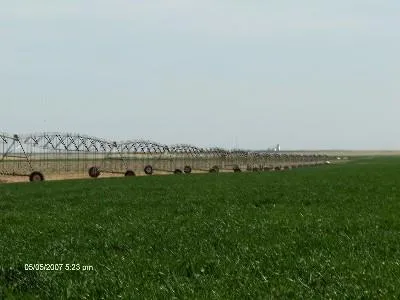 There are four irrigation wells in use with turbine pumps powered by natural gas engines and a booster pump and 30 KW generator powered by a natural gas engine to provide water pressure and electricity for the sprinkler. These wells are all tied together with PVC pipe (mostly 50 # pipe-some 22 #).