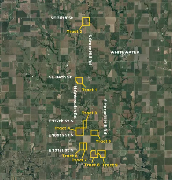 9 Tract Land Auction! Offering 1,078.96 acres in Sedgwick County, KS, and Harvey County, KS, this land auction features highly productive cropland with quality soils, as well as prime home site and hunting opportunities. The auction will take place on Saturday, November 23rd, at 9:30 AM, with both live and online bidding available. The event will be held at 1551 N. Waterfront Pkwy, Wichita, KS 67206 (Commerce Bank Building). The sellers mineral interests will transfer with the real estate, and FSA and tenant information is available upon request. This auction consists of 9 tracts. Tracts 1 through 5 will be offered individually in numerical order, while tracts 6 through 9 will be offered by choice. The high bidder will get to choose which tract(s) they want to purchase from tracts 6 through 9. Rounds of bidding will continue until all tracts 6 through 9 are spoken for. Please note, we will not alternate between tracts during the auction. Bidding will be conducted on a per-acre basis with no buyers premium. Online bidders must be available by phone during the auction. This is an incredible land buying opportunity in central Kansas. dont miss out! Online bidders are advised to thoroughly review the terms and details provided on the online bidding site. Any announcements made the day of the auction supersede any other advertised material. The property is being sold in its current "Where Is, As Is" condition, without any warranties. Sale is subject to seller confirmation with closing within 30 days. The successful bidder must immediately execute the provided auction purchase agreement and deposit 10% of the gross purchase price as earnest money within the specified time outlined in the agreement. Bidding is by the acre; take your bid amount times the total number of acres noted on the brochure to determine the total purchase price. The auctioneer may, at their sole discretion, reject, disqualify, or refuse any bid. Broker forms, if any, are available on the bidding site. While all information is deemed reliable, buyers are encouraged to conduct their own due diligence. The sale is not contingent on financing, appraisal, or inspection, and the winning bidder must be available immediately post-auction. The property is sold subject to applicable Federal, State, and/or Local Government regulations, with all measurements and details approximate and non-binding. The auctioneer provides no warranties regarding the online bidding platform's performance and assumes no liability for any bidder-incurred damages during its use, including unacknowledged bids or errors. Bidders accept all risks associated with the platform and acknowledge that the auctioneer bears no responsibility for bid submission or acceptance errors or omissions. Auctions may be subject to selling prior to the auction date.