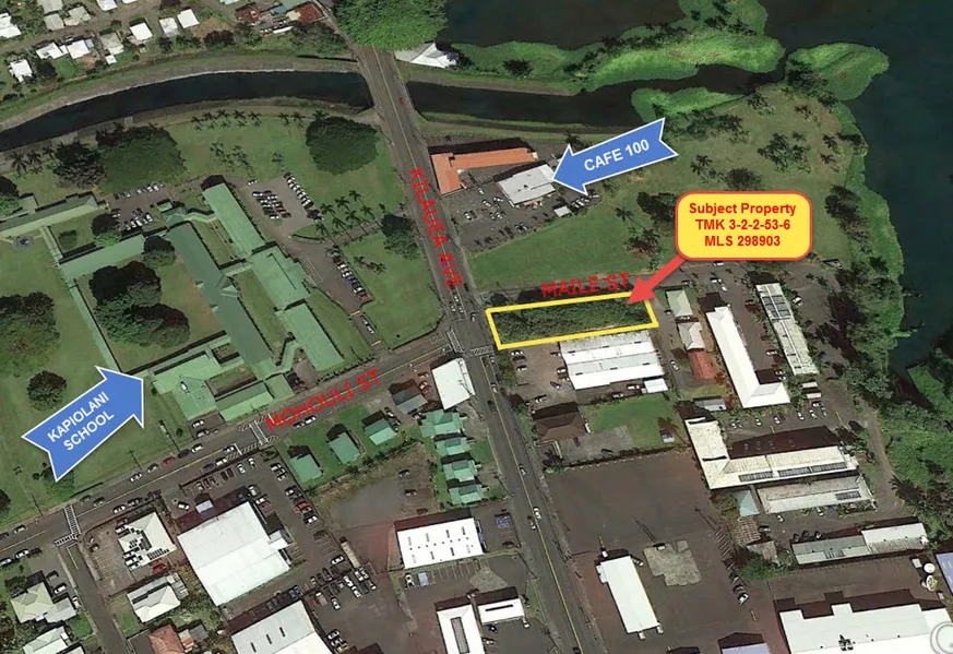 High visibility corner location on Kilauea Ave. and Mohouli St. near Hilo landmark "Cafe 100" and Wailoa River State Park. Vacant lot is located at a corner intersection with a traffic light and is an ideal commercial building location. Just blocks away from the State courthouse and the County buildings on Aupuni St. Easement granted by DLNR for Maile St access.