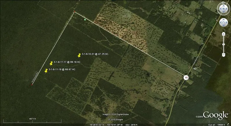 If you prefer smaller or larger parcels, see 1-8-10-31 for 47.25 acres at $1,250/ac. and 1-8-11-17 for 99.18 acres at $1,250/ac. The 99.18 acres is adjacent to the 68.67 ac. parcel. All three lots are offered by the same owners and are located in the Olaa Reservation Lots Subdivision, near each other. Prices are firm, so please don't bother low-balling - this is as good as it gets. Owners have priced this lot to sell quickly, so take advantage of the current buyer's market. A price discount may be available for a single purchase of two or all three lots to close escrow concurrently.
