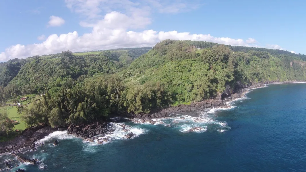 Over two acres, pristine and private, almost oceanfront, bordering seasonal stream on the north side of Laupahoehoe Point.