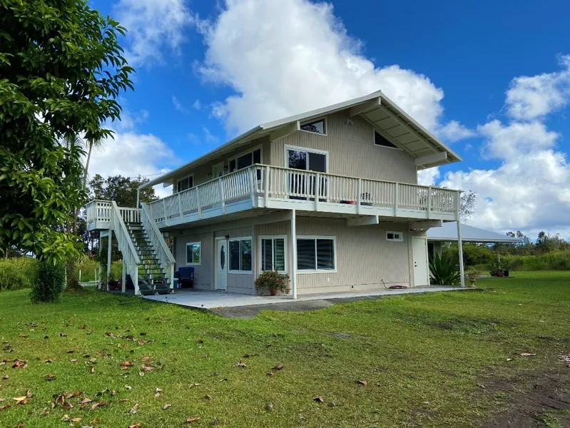 This property is landscaped with numerous fruit trees including banana, orange, pear, macadamia nut, & coffee. Also found are plenty of ornaments, tropical palms and foliage, including yellow-blooming Ohia, red Ohia, Tree Ferns, Koa, and Bamboo. Palm trees line the driveway. There is a peekaboo ocean and mountain view from upstairs deck. This lovely property is located minutes away from hiking in the scenic Volcanoes National Park, and shopping in Keaau.