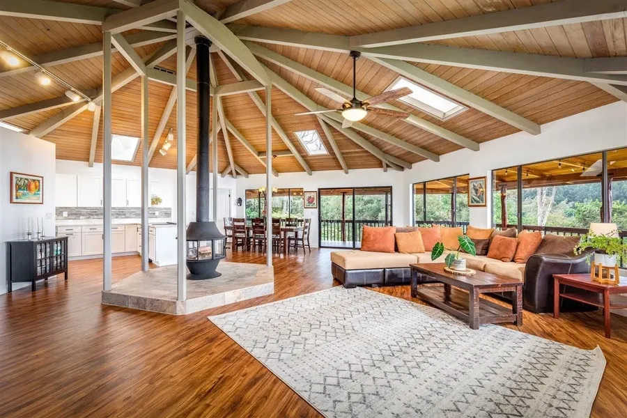 At a cool 2300 elevation, this 3 bedroom, 2 bath home is surrounded by larger parcels of land with lots of privacy and offers expansive ocean, sunset, mountain, and unique treeline views. The house has been designed with 360 degree views with large windows, bringing the beauty of nature in, while you listen to the birds singing in the ohia trees.
