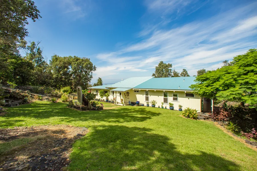 Beautiful 2 bedroom 2 bath home with only 1 owner. Large covered lanai for entertaining and extra living area. Located at approx. 1,000 foot elevation on the makai side of the road. Private and serene with 5 manicured acres with approx. 400 coffee trees., bananas, papaya, Mac nuts, pineapple and a variety of fruits. Cute little coffee shack for guests or a studio/office area. Open beam ceilings, open floor plan. Come live the South Kona life style!