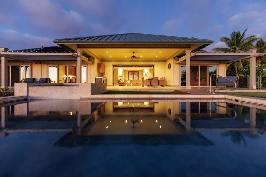 The interior is spacious, open, and filled with natural light, spanning 3,675 square feet with luxurious finishes throughout and a covered balcony of 1,252 square feet. The gourmet kitchen features stainless steel appliances, custom cabinetry, and a large peninsula island perfect for preparing meals and entertaining guests. The gracious dining room overlooks the expansive horizon view. There are two outdoor rainfall showers designed with Hawaiian lava rock walls, and the property has been developed and landscaped creating a sense of privacy unparalleled in the Heathers. Powered by XX photovoltaic panels, this property offers luxurious resort-style living with eco-friendly features.