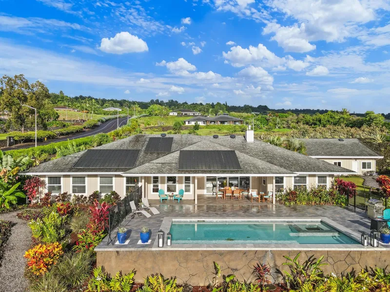 First Time on the Market!brWelcome to this pristine, single-level home, a true gem built in 2017 and lovingly maintained by its original owners. Just over 2 acres of beautifully landscaped grounds, this property offers a serene and peaceful escape. Immerse yourself in the lush environment, featuring mature, fruit-bearing trees and an array of vibrant flowers and foliage.brThe property includes a bounty of coffee, avocados, mangoes, grapefruits, limes, lemons, oranges, starfruit, papayas, bananas, abiu, cacao, dragonfruit, white and yellow pineapples, and even vanilla.brIdeal for both relaxation and entertaining, the homes indoor living area seamlessly flows to the lanai, pool, and integrated spa, where you can enjoy stunning sunsets and create lasting memories. The peaceful neighborhood setting is perfect for sipping a cup of homegrown Kona coffee while taking in the picturesque coastline views.brbrHome Features:br brSingle-level 4 bedrooms, 3.5 bathrooms, and a dedicated office in main home.br Additional amenities include a 2-car garage, an additional permitted boat garage, workshop, and a separate Ohana unit.brThe Ohana unit offers 1 bedroom, 1 bathroom, a living area, and a kitchenette.brbrAdditional Highlights:brbrAcacia wood and tile floorsbrQuartz countertops and cherry wood cabinets throughout homebrIn-ground propane plumbing for tiki torches, fire pit table, and BBQ grillbrGas fireplacebrEpoxy garage floorbrRecirculating hot water system in the primary bathroombrWired for a security system brOwner owned net-metered solar panelsbrGas-heated and rooftop solar saltwater pool and integrated spabrTiled pool deckbrUnderground irrigation sprinkler system throughout the propertybrHot and cold water to the outside of the house and boat garagebrFully fenced corner lotbrbrThis home offers flexible living spaces and a range of modern amenities, making it the perfect place for a variety of lifestyles and needs.