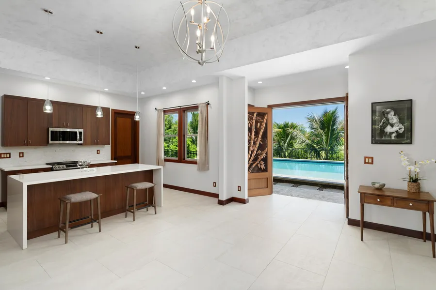 The open concept living area has an ocean view and high tray ceilings. The indoor kitchen has stainless steel appliances, custom cabinets, and a large quartz island. There is also a barbeque area on the back lanai. The master bedroom has a separate tub and shower room and his and hers sinks. There are 2 spare bedrooms. Ornate doors open up onto the fenced pool and koi pond (with fountain) from the living area. There is custom woodwork, brick work and rock work throughout the property.