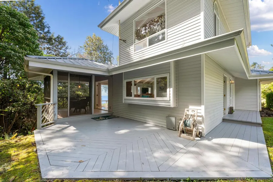 HAWAIIAN COUNTRY CHARMER ON 1.8 LUSH ACRES WITH AN OCEAN VIEW. Private driveway to the custom home features high open beams throughout. The light and bright open concept living area is complete with a spacious kitchen, butcher block island and breakfast bar. Large view windows in the great room and a fireplace. The living area with french doors that opens onto the screened-in lanai for your alfresco dining and entertaining. Plus an open porch overlooking the gardens. The large ensuite is complete with a walk-in closet and a private balcony with ocean and garden views. Ensuite bath includes a tiled walk-in shower with accent tiles & block glass. Nicely remodeled power room on the main floor. The upstairs guest room is private with ocean views. A very spacious laundry room is located downstairs, which also houses the water pump & filter as well as a large storage area. Expandable for a pos...