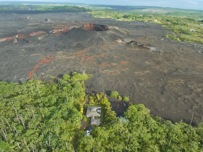 Access to the property is via a long winding driveway. The property boasts lush landscaping, a true Hawaiian paradise that offers plenty of outdoor space for enjoying the island's beauty. The garden has been lovingly cultivated with local plants, making it both serene and sustainable. The lava eruption of 2018 left behind a spectacular landscape of some of the world’s newest Earth. This home survived despite being only 100 feet from Fissure 8. This property offers a rare opportunity, offering visitors a unique experience to witness the island’s historic volcanic activity firsthand, while still enjoying peace and privacy.