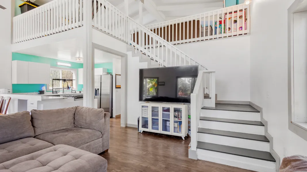Escape to your own private oasis on a lush acre of tropical paradise! This 2025 beautifully updated and remodeled fully permitted home offers the perfect blend of cozy charm and modern convenience. Boasting high ceilings with exposed beams and laminate flooring throughout, this move-in ready home features 2 bedrooms and 1 bathroom. The spacious loft (approximately 371 sqft) currently serves as a second bedroom, and is perfect for a game room, or additional living space. The loft comfortably accommodates two full-size beds, sofas, and more. An additional 216 sqft includes a covered lanai and laundry room.