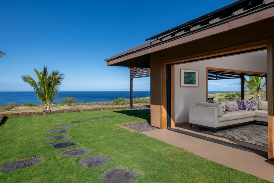 The house features polished concrete floors, stucco siding, a standing seam metal roof, vaulted ceilings, Cambria Quartz countertops, and custom bamboo cabinets and shelving. Huge Western pocket doors open to the most incredible ocean view, a large covered lanai, and a beautiful lawn. The front of the home features an open concept kitchen and bar designed for entertainment and cooking. The outdoor “island spa” in the back has a two-person soaking bathtub and an indulgent lava rock shower. The main house consists of two bedrooms, an office, and a small loft, while the 720 sq. ft. detached building is available as a master bedroom, guest house or rec room. The home is completely off-grid, featuring a photovoltaic system with a battery bank that lets you run the air-conditioning 24/7. Water is sourced from a well, treated with an automated reverse osmosis water filtration system producing 100 gallons of freshwater per hour, and stored in two holding tanks. Solar and irrigation systems are also automated and can be monitored and controlled remotely. A place of history, peacefulness, and sustainable luxury, this eco-estate is more than just a home—it’s a place of tranquility. Experience the magic of North Kohala’s coastline, where history, culture, and nature come together in perfect harmony.