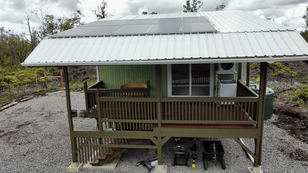 Your Tranquil Island Retreat Awaits! Escape to your own private sanctuary with this charming studio. Peacefully nestled on approximately 3 acres of lush ohia forest. With 1 acre completely fenced in, capable of keeping in your animals, you will have the security and peace of mind to get your homestead up and running in no time. Thoughtfully crafted and lovingly maintained, this cozy retreat offers the perfect blend of comfort and natural beauty. Step inside the light-filled living area, where vaulted ceilings, oversized windows, and Koa countertop invite the outdoors in. Lifeproof floors and cedar tongue & groove helps to make it easy to maintain while smelling great and minimizing mold. The open-concept kitchen flows into a quaint lanai - an ideal spot to enjoy your morning coffee while soaking in the cool mountain air, admiring your beautiful plants, and listening to the serene sounds of nature. This off-grid haven is fully equipped with a 10-panel, 3.4Kw solar array and a 280amp/hr LiFePO4 battery bank capable of powering the refrigerator, washing machine, dryer, range, and other appliances. Should a storm come, a backup generator is also in place to charge the battery bank via gasoline or propane. Propane fuels an on-demand water heater and stove. The catchment system holds approximately 1,550 gallons and is equipped with a four-stage filtration system including UV sterilization for added water quality. The property includes a security camera which can be controlled remotely and provide activity alert in case you need to get away or check on your animals for additional peace of mind. Enjoy "an impressive selection" of edible plants, including Rhubarb, perennial collard greens, Swiss chard, Garlic Chive, Puerto Rican, Greek, and Cuban Oregano, Rosemary, Tongan Spinach, Sugar Cane, Plum, 5 varieties of banana, Cherry Tomato, Cassava, Chaya, yellow and purple lilikoi, Tea, Grafted Avocado, Fig, Orange, Lemon, Kalo, Tamarillo, Lemon Grass, and many more!