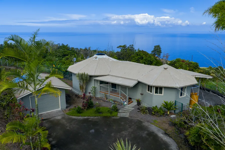 This sweet redwood cedar cottage will charm you from the moment you enter and only bring you more to be delighted and amazed by as you walk out onto the lanai that extends across the entire ocean-facing front. every room has a view to the beautiful blue Pacific Ocean and Kona coastline!Owners have done lovely upgrades to this unique, multi-faceted home that have only enhanced its charm. *remodeled guest bathroom & kitchen with solid granite countertops & vessel sink in bath*replaced main bathroom window with leaded, stained glass art of swimming turtles*remodeled & enlarged main bath shower with ceramic tile*installed luxury vinyl flooring throughout*added lighting sconces in guest bedroom*installed remote controlled entry gate as well as a lower gate for an alternative entry*chain link fencing with vinyl coating surround the area below the home for your precious pets*two hog wire fenced paddocks for large animal grazing*installed a convenient outdoor rain barrel shower*installed 2 solar panels for hot water*installed a Fujitsu split AC unit in guest bedroom*installed two additional ceiling fans on lanai in addition to the 3 interior fansThe 10,000 gallon water catchment tank is outfitted with a potable water filtration system with UV to cover all your needs. This private, 5-acre sanctuary is completely fenced and terraced with rock walls that showcase the bamboo, mature royal palms, citrus and ornamental plants galore; and there is still plenty of room to grow a sustainable garden for your family's needs. Come take a look!