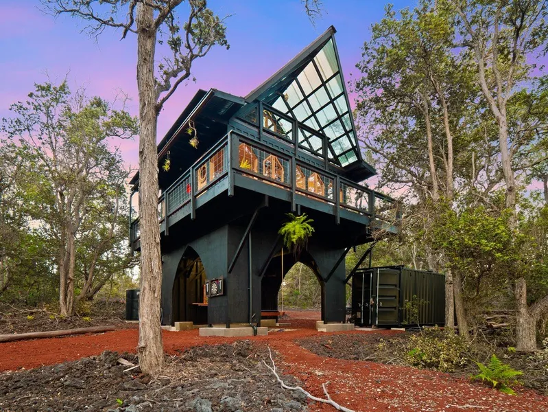 Built in 2024 | 2 Acres | ~ 375 SqFt. Interior + 200 SqFt. Loft + 200+ SqFt. Lanai Designed by a visionary architect, this playful, off-grid luxurious, treehouse retreat vacation home combines modern innovation with eco-friendly living. Situated on 2 acres of old-growth Ohia forest at 3,000' elevation, with an ocean view from the lanai, this is a rare find. Whether you're looking for a private retreat, sustainable living, or an artistic escape, this property delivers. *Offered turnkey and fully furnished. Sustainable Living Highlights: * 15kW solar system, capable of powering appliances and charging electronics. Includes a 1-year-old Honda 1,000W generator for backup power. * 1,150-gallon water collection system with sediment, particulate, an automatic cutoff switch, and a UV filtration for drinking water quality. * Screened gutters to prevent debris * Septic * Lush grounds featuring loquat, lime varieties, tree spinach, fig, tapioca root, Surinam cherry, sweet potatoes, and more. * Ideal microclimate for year-round gardening and outdoor living Architectural Beauty: * Star Lounge loft with translucent roof accessed by a ships ladder and trapdoor. * Disco Den complete with a swinging bed and disco ball. * Wraparound lanai with ocean and horizon views, perfect for stargazing or relaxing with the sound of nature. * Offered furnished all the way to linens * 20' shipping container includes heavy-duty shelving, ladder racks, dehumidifier, and two ladders (24' and 16'). Additional Features: * Starlink internet * Full kitchen * Ring security camera * Purchase includes 2 acres with separate TMKs: 3-9-2-64-59/60 Ocean View has 2 grocery stores, 3 gas stations, several eateries and a Saturday morning swap meet. It is approximately an hour drive to Kailua-Kona and 2 hours to Hilo. ** Improvements were made without permits
