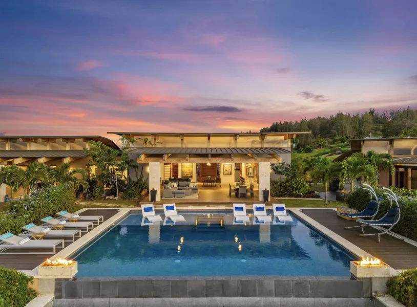 Experience the pinnacle of island luxury living at Nanaina Kai Estate-a legacy property masterfully positioned along the vibrant Hamakua Coast. Hamakua's namesake evokes the pristine, invigorating air of the region, carried by trade winds that traverse the northeast cliffs. Spanning 25 acres, this architectural masterpiece combines sustainable innovation with wellness-centered design for mindful living, offering spaces for fitness, relaxation, meditation and immersion in nature. The estate boasts a private gym, a solar-heated saltwater pool, and 4 luxury stucco pods with 5 ensuite bedrooms, each positioned to ensure privacy and capture unobstructed views of Waipio, Maui and the endless Pacific horizon. The organic architecture-with curved rooflines, 16' open-beam ceilings and clerestory windows-fills the interior with natural light by day and unveils starlit skies by night, creating feng...