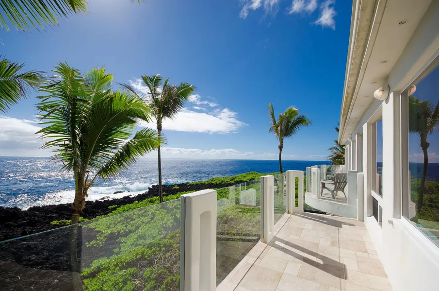 The two-story great room has a double-sided wood burning fireplace, clerestory windows, recessed lighting, and a curving staircase with custom wrought iron balustrade. The stairs lead to a piano balcony with spectacular views of Isaac Hale Beach Park. Step outside onto the transparent-paneled balcony for unobstructed views of migrating whales and passing fishing boats. Sit and enjoy the gentle trade winds and the sound of the surf. Youll feel like you are on your own island.
