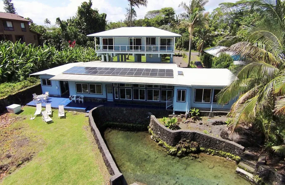 This one of a kind ocean front stunner in Keaukaha is perched over a gorgeous tide pool, footsteps from a pristine sandy-bottomed lagoon and small white sand beach.