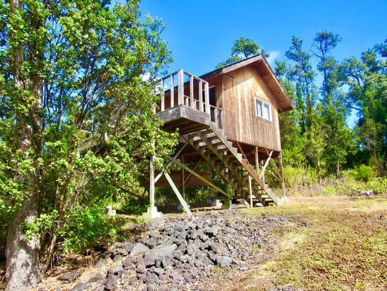 Private Cabin with attached indoor bathroom and lanai nestled into the back of a wide lot in Hawaiian Ocean View Estates. Here is your opportunity to carve out and finish your own Hawaiian paradise in a tranquil setting. Cabin is currently unpermitted but is well built and has the potential to be permittable as it comes with an already installed septic system! Lot has been graded and a long roundabout driveway provides easy access to the cabin as well as an additional potential building location at the bottom of the lot. Power is available at the road and can be hooked up when a permit is pulled. All SSPP fees have been paid. Property has been beautifully landscaped with mature jade succulents, bromeliads, orchids, ginger and agave planted throughout the tall Ohia trees that provide excellent privacy. Hawaiian ocean view estates is a growing community with grocery stores, gas stations, h...
