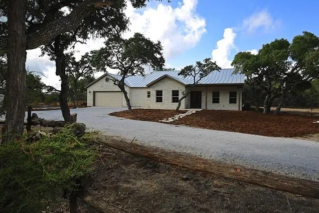 Beautiful new construction with Blanco River Access! Home features cabinets galore and granite countertops in kitchen, metal roof, fireplace, garage door opener, tile floors, covered back porch, partial fenced, breakfast area, dining room, large utility room, and pantry. Looking for some elbow room this property has it including chip & seal driveway, and partial fenced. The 1.05 acre lot has a variety of hardwoods scattered throughout. Private River Park through Home Association provides access to the crystal clear waters of the Blanco River.