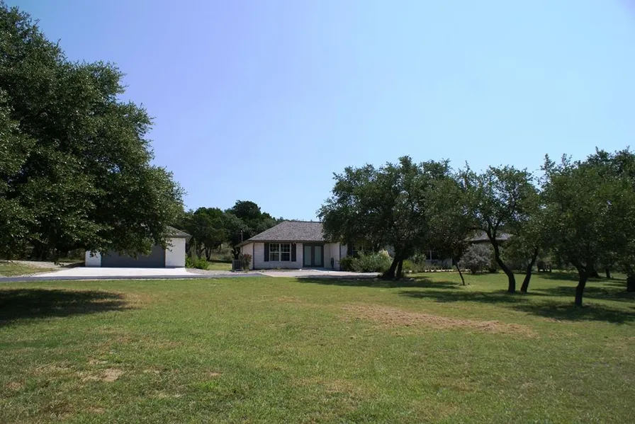 SERENITY! Enjoy the peace of the gorgeous hill country on almost 6 acres fenced with mature oaks & perfect for horses. Flexible floor plan with open kitchen to living, huge living with vaulted ceiling & exposed beam. Spacious game room off utility room plus 4th bedroom or study area with nice size bedrooms & detached garage. The home was updated in 2015 with quality appliances, granite counters, fixtures & much more. Private neighborhood on large acreage tracts & minutes from town.