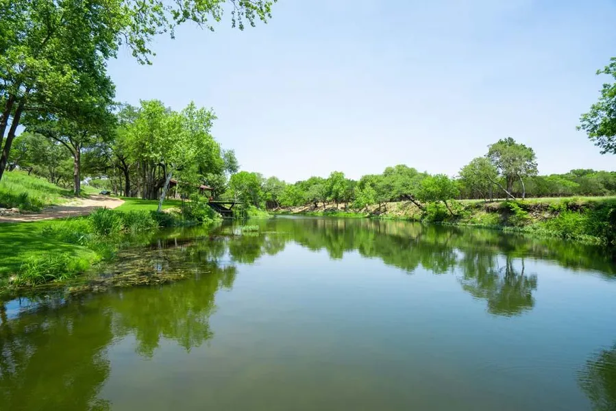 Encounter the majestic sprawling grassy shoreline and strategically placed fishing camp that is located on both sides of the creek (2,000+ feet) and an encompassing custom stone trail that wraps around and leads you to a built-in fire pit.