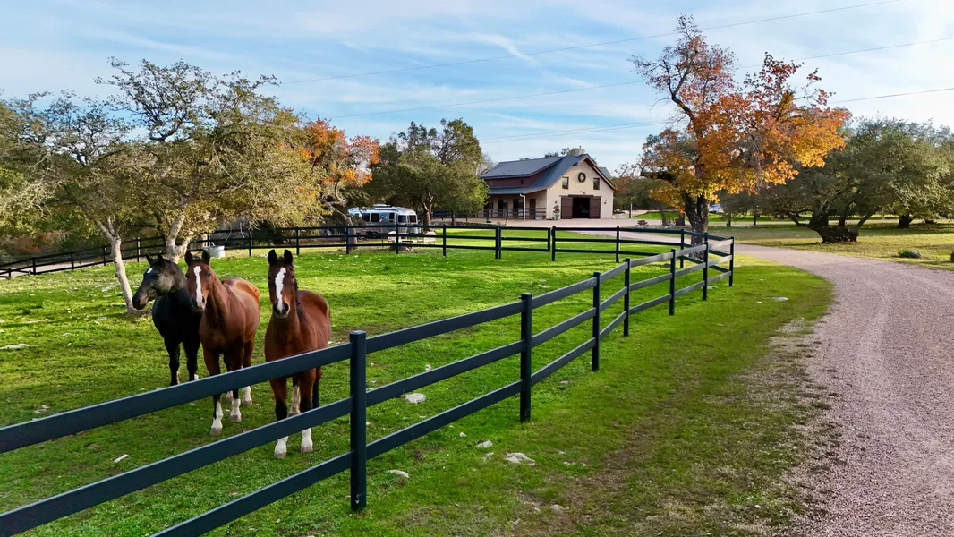 Landscape: Upon entering the private entry gate, youll be impressed by a series of manicured paddocks adorned with large Oaks and brilliant rye grass. Then, as you move further into the property along the riding trail system, youll cross a concrete low water crossing over a seasonal creek to ascend to what feels like the top of the Hill Country near the eastern edge of the property. From here, it is easy to envision the construction of a new residence to take advantage of the striking westerly views. The privacy, serenity, and boundless views created here make the property feel much larger. In addition to the seasonal creek, there are two other small water tanks that help supplement the abundant wildlife of Deer, Turkey, and Dove. Amidst riding trails and creek bottoms, the landscape seamlessly blends with the facilities, creating a practical yet aesthetically pleasing equestrian retreat.