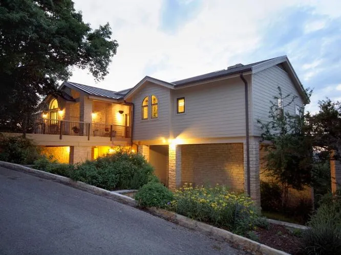 THIS HOME ON 2.89 +/- ACRES FEATURES SUNSETS IN WIMBERLEY TEXAS WITH ONE OF THE MOST SPECTACULAR VIEWS IN TOWN. THERE ARE MANY OPPORTUNITIES FOR VIEWING WILDLIFE FROM THE DECK ABOVE THE BACK YARD. NEIGHBORHOOD RIVER PARK ACCESS. KITCHEN HAS A CLEAN AND FRESH ATMOSPHERE AND HAS A CENTER ISLAND, CORIAN COUNTER TOPS, WARMING/PROOF BIN, DOUBLE OVEN, NUMEROUS CABINETS AND LARGE PANTRY NEXT DOOR IN THE UTILITY ROOM. THE DINING ROOM, LIVING ROOM AND ALL THE BEDROOMS INCLUDING THE MASTER HAVE EXTERIOR PELLA FRENCH STYLE SLIDING DOORS INSTALLED IN 2010. QUARTER SAWN OAK WOOD FLOORS, CARPET IN MASTER AND GUEST BEDROOMS, TILE IN KITCHEN, LAUNDRY AND ALL BATHROOMS. DOWNSTAIRS IS A LARGE ROOM WITH KITCHENETTE (REFRIGERATOR, SINK AND CABINETS) THAT COULD BE A GUEST ROOM, 2ND LIVING ROOM, BEDROOM OR WORK ROOM. ATTACHED TO THE HOUSE IS A TWO CAR GARAGE WITH HALF BATH, AND A WORKSHOP/STORAGE BELOW THE HOUSE. LOW MAINTENANCE LANDSCAPE INCLUDES A SMALL GRASS AREA AND TIERED PLANTERS WITH SPRINKLER SYSTEM. ENJOY THE ABUNDANT WILDLIFE AND THE OPPORTUNITY TO LISTEN TO THE BLANCO RIVER, AS IT BENDS BELOW THE HOUSE, FROM THE DECKS ABOVE. A CHARMING LOW WATER CROSSING BRINGS YOU INTO PARADISE HILLS TO YOUR PARADISE HOME.