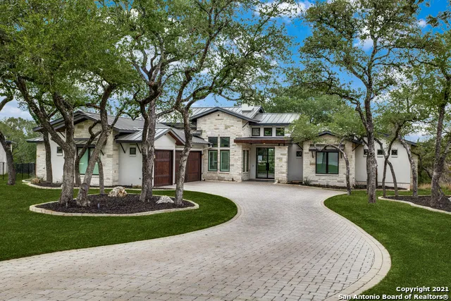Nestled in the surrounding live oaks for a sense of intimacy and designed to capture the heart of Hill Country Living at its finest, this luxurious estate invites you into the home with a stunning entryway with oversized glass doors with instant views of the private park-like backyard. Inside, the fabulous details continue in this open-concept layout with high, coffered ceilings, unique designer light fixtures, blonde hardwood floors, and sleek stone gas fireplace with glass to exemplify the flame. An elegant kitchen is primed for culinary adventures with custom cabinetry, Thermador appliance package (including a 6-burner commercial-grade gas range), custom vent hood, and expansive island with casual bar seating. LifeIonizers water system throughout the entire home, unaffected by boil notices. One of two dining areas is perfectly appointed with a beautiful dry bar offering wine storage a...