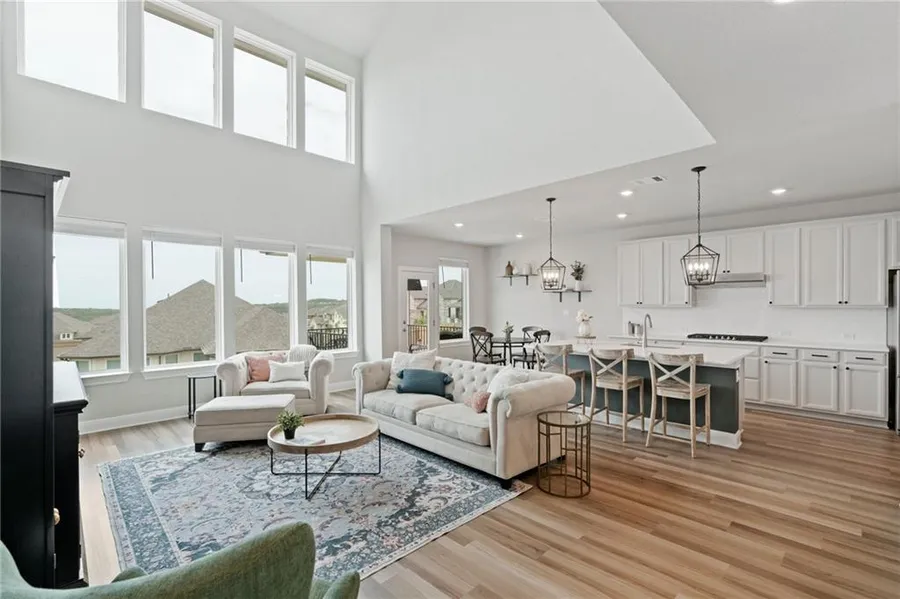 BEAUTIFUL "LIKE NEW" HOME W/AMAZING VIEWS! This corner lot home features rare to find brick on 3 exterior sides, as well as, 4 bedrooms, 2.5 bathrooms a large open flex space & an epic bonus room that makes the perfect movie theatre space! This open, modern floor plan w/ ample windows throughout provides UNBELIEVABLE bright spaces & has nearly 3,000 SF of living space. The living room & kitchen make the home perfect for entertaining, w/ an oversized island & tons of storage. The formal dining room is highlighted by beautiful wood floors, while the primary bedroom also located downstairs features a bright & airy space w/ vaulted ceilings & a spa-like master bath - including, double vanity, soaking tub & large separate shower. Located upstairs are the 3 additional bedrooms & bathroom along with the movie theatre space & the spacious open flex room featuring a large walk-in closet, perfect for storage or could be easily converted to an additional bathroom! Outside you are greeted w/a covered patio, perfect for relaxing on. Additionally, you also have a 240 SF concrete patio below for added entertaining space OR the perfect outdoor kitchen set up! The back yard also features 3 trees, one of them being a healthy apple tree. The yard also has a new shed which provides optimal storage space, & a 6' wide gate was added on the east side of the fence for easy storage of a trailer, boat, ATV, etc. Located in Big Sky, once completed the neighborhood will feature approx. 48 acres of park space & will also boasts approx. 3 acres of amenities which will include things such as an amenity center w/pool, splash pad & playground. They will also feature trails that will connect to surrounding attractions such as Founders Memorial Park & it is within walking distance to Historic Mercer Street, HEB, restaurants & more! Home is also available for lease at $3,400 a month.