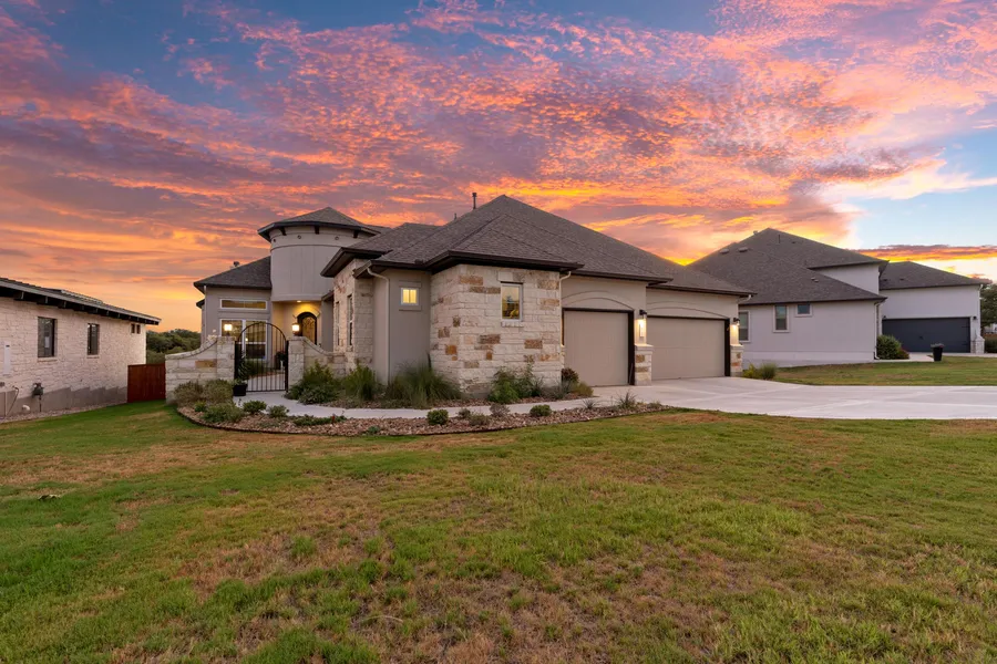 Incredible single-story Scott Fielder-built home situated on a quarter acre greenbelt lot. Amazing sunset off the extended back patio and outdoor kitchen area. This stunning home features four bedrooms, all with ensuite baths, one half bath home, a dedicated office, a large dining area, and a game room that provides the most efficient use of space. Enjoy this amazing chef's kitchen with upgraded appliances, extensive cabinets with custom pull-out drawers, stove pot filler, and an extended Quartz countertop for additional causal seating. Custom bar area with glass front cabinets located in the game room.