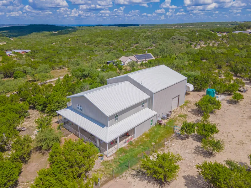 Sitting on 6.65 acres of beautiful Hill Country this 6600 SF barndominium with 4100 SF of finished living spaces plus another 2500 SF of indoor shop/storage space with rollup door for interior parking. Six bedrooms, 4 1/2 baths, 2 living areas, plus two bonus/flex rooms that offer ample space for an office, work-out room or media room. Approximately 2.5 acres is fully fenced. The property also includes a 2500 gallon storage tank, RV hookups, storage shed and an existing unused 100 amp electrical service for future expansion. Enjoy amazing hill country sunsets from your gorgeous wrap around porch and enjoy endless starry nights. Approximately 20 minutes from downtown Dripping Springs with very few restrictions, no HOA and a low tax rate.