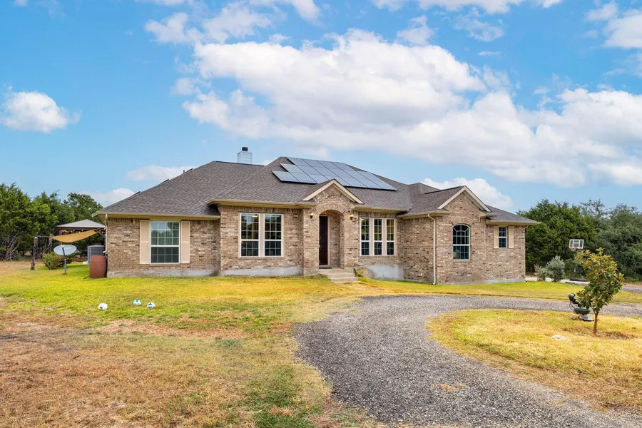 Five acres fenced with an electric gate, this immaculate 3 bedroom home offers stained concrete floors, a private office with built-in bookshelves and workout room with sauna! Open floor plan with floor to ceiling stone fireplace as the focal point of the living room. Formal dining plus a breakfast area. The island kitchen with breakfast bar overlooks the living area and features rich expresso cabinetry, granite counters, stainless appliances, electric cooktop and built-in oven and microwave. The luxurious owner's ensuite is large enough for a sitting area and features a soaking tub, dual vanity with granite counters and an extended walk-in shower. Entertaining will be so much fun with a covered pavilion and in-ground pool! Horses are allowed, 5000 gallon water reservoir. Solar panels on the home allow for lower energy costs. Just 10 minutes to the fun areas of Wimberley and Canyon Lake....