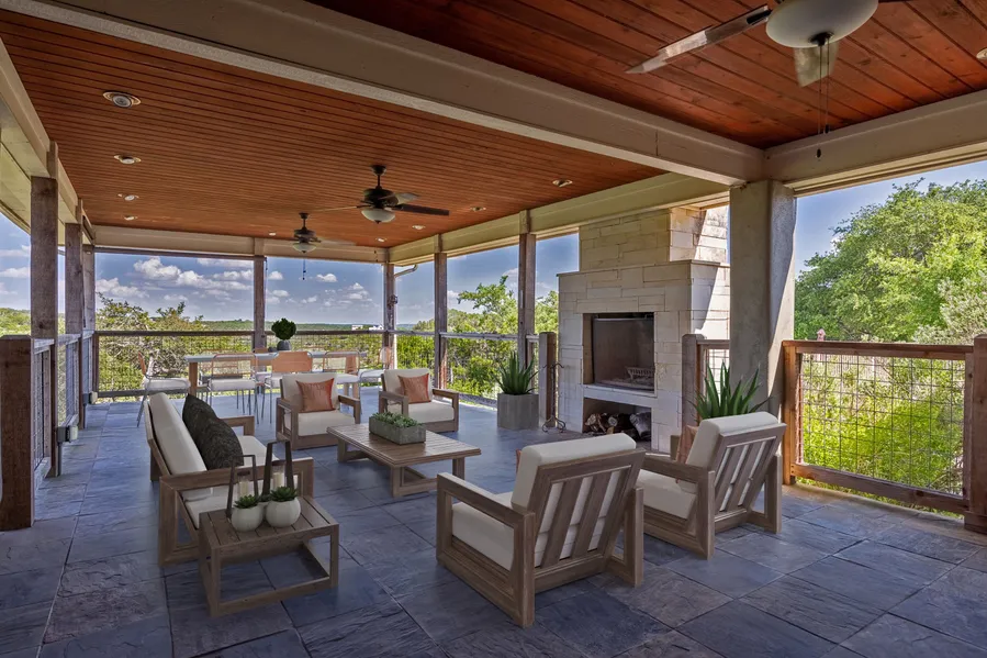 Newly shined up to sparkle with $10K in improvements. The perfect spot to enjoy your spectacular Hill Country view! Beautiful covered deck with cozy fireplace adjacent to sparkling in-ground pool, filled by rainwater collection system. Perched on over 5 acres, this single-story home has numerous design features including all wood floors, soaring ceilings with wood finishes and large windows to bring the outdoors in. The massive main bedroom includes a spacious sitting area, built-in bookshelves, all looking out onto the expansive view. Unique side-by-side ensuite baths open to private flex space that can be used as exercise space, office hideaway or den. Walking trails and the wet-weather creek offer an opportunity to enjoy nature without ever having to leave your home. High deer fencing surrounds the property with wrought iron along the entry and pool & cedar fences ½ acre behind the...