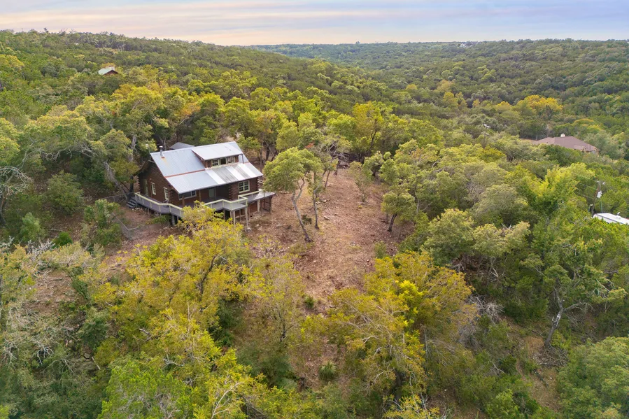 Five minutes away from Wimberley Town Square and Blue Hole Park and less than an hour from Austin, this log cabin is a move-in ready sanctuary. Situated high on a wooded two point five acre lot, the home features expansive views of the surrounding hills. The expansive deck includes both covered and uncovered areas. Inside, large beams grace the living area, with its woodburning stove as a focal point. A breakfast room with scenic views creates a cozy corner for dining. Downstairs is a bedroom and bathroom, with a spacious loft upstairs with room for sleeping, office, art or crafts. Must see!