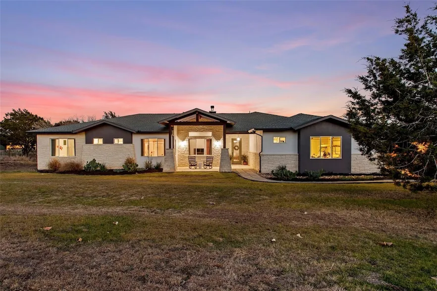 This incredible 2-acre property includes a custom built 3,039 sq ft home PLUS an 836 sq ft detached guest house with its own 3-car garage. The 4-bedroom, 3-bath main residence features a bonus room, walls of windows, and oversized sliders for seamless indoor-outdoor living. The open-concept living room and kitchen have soaring 13 ft coffered ceilings, a wood-burning fireplace, custom cabinetry, a 66 commercial fridge, dual-fuel range, built-in wine storage, and a walk-in pantry with unique details and polished concrete floors. The primary bedroom has a huge glass slider opening into the pool area and the primary bath has a frameless glass shower, freestanding soaker tub and another glass slider that opens to a private deck with a fenced in garden, outdoor shower and chicken coop area. Two bedrooms share a jack and jill bathroom with a tub/shower combo. Built in 2020, the detached guest house has soaring ceilings, a full kitchen, living room, bedroom, designer bath with ADA shower, walk-in closet, and stackable washer/dryer ideal for multi-generational living or rental income. It also includes a covered porch and 3-car garage with tree covered privacy from the main house. The9 ft deep heated pool and spa feature a waterfall, raised jumping ledge, LED lights, and beautiful pergola with curtains. Enjoy the 3-hole putting green, huge covered patio and artificial turf around the pool. The 16x16 treehouse with a pull-down movie screen is perfect for outdoor movie nights or star gazing in this dark sky community. For homesteading, keep up to 15 chickens in the coop with an automatic door. Grow veggies or flowers in the fenced garden, relax on the private deck, or cool off in the outdoor shower. Up to 2 horses are allowed on the lot. Store your boat or RV in the 16x35 ft metal carport with access to the backyard by electric gate. This one-of-a-kind property offers the best of Dripping Springs living. Call today!