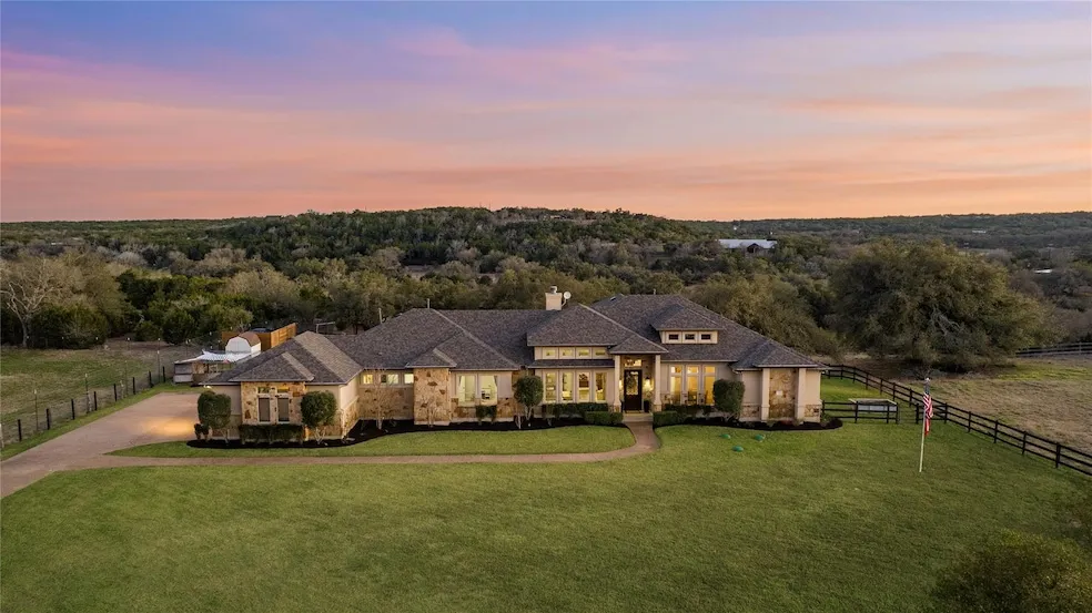 This stunning Hill Country home sits on 2.46 acres in Driftwood, offering private Onion Creek Ownership and sweeping views toward Wimberley. Situated at the end of a cul-de-sac in a small neighborhood, it borders a large private ranch for added privacy. A private gated entrance leads to a thoughtfully updated home with a new 2023 roof, fresh white interior paint, and refinished grey-navy cabinetry. Designer lighting enhances the main living areas, while large windows fill the single-level layout with natural light and scenic views. The foyer opens to a spacious great room with high ceilings, a wood-burning fireplace, and cedar-accented office beams in the office. The large kitchen has custom cabinetry, stainless steel appliances, granite countertops, a large island, and a pantry. The primary suite, set apart on one side of the home for privacy, features high tray ceilings, large windows, and an ensuite with double vanities, a soaking tub, a walk-in shower, and an oversized closet. The opposite wing includes three secondary bedrooms, three bathrooms, and a second living area ideal for a media room or playroom. A Jack-and-Jill bath has an exterior door leading to the pool for easy outdoor access. Designed for outdoor living, the back patio overlooks the horse paddock, while the heated pool and spa provide a fun place to splash under the string lights. Sunset views stretch across rolling hills, perfect for evening gatherings or stargazing in this dark sky community. Fully fenced and cross-fenced, the property includes space for two horses, a pole barn, and a chicken coop. Live oaks stretch across the horse paddock, with sunset views along the tree-lined cliffside. Conveniently located between Wimberley and Dripping Springs, the home offers country living with easy access to some of the Texas hill country's best shopping, dining, breweries and entertainment. Zoned for Dripping Springs ISD, including Dripping Springs Elementary in the fall.