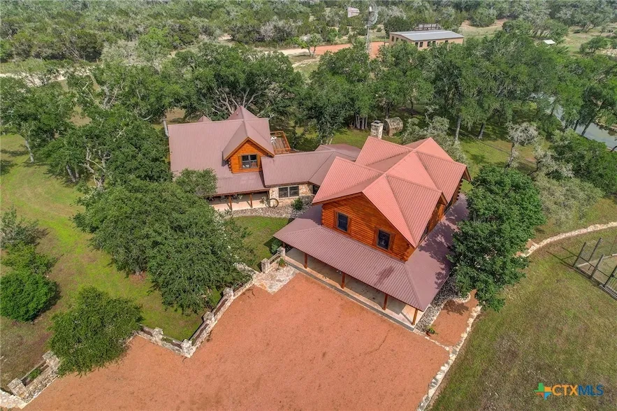 This beautiful 5-acre property, located just 10 minutes from the historic Wimberley Square, backs to a large ranch and features a serene pond with a fountain. With a total of 8,600 square feet, the very versatile property features a well-crafted log home with 5,000 square feet of living space. The home offers 3 bedrooms and 2 open loft rooms, providing the potential for up to 5 bedrooms. Vaulted ceilings with star-patterned beams add architectural charm, while the living room includes a cozy wood-burning stove, and the Great Room features Colorado-sourced beams and a native stone fireplace. The home also includes 2 kitchens, one with new appliances and granite countertops. Upstairs, the master suite boasts a luxurious bath with a Jacuzzi tub. A 3,600-square-foot second house, completed in 2024, serves as a dual-purpose structure crafted with Cypress wood salvaged from the Historic Flo...