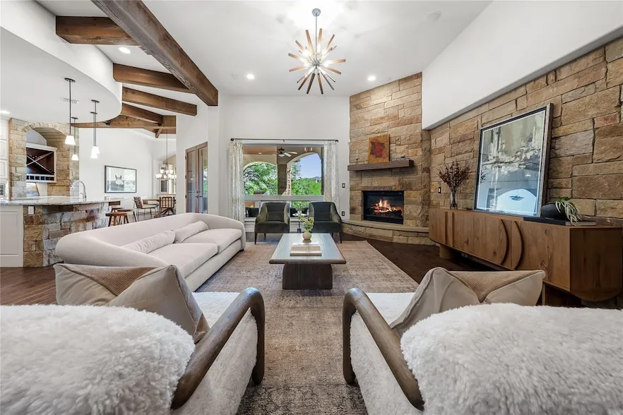 Step inside and you ll be instantly struck by the architectural poetry of this residence. You might even feel like you are in a Godfather movie with the rich tapestry of natural Texas stone runs throughout the home, grounding the interior in timeless craftsmanship while adding organic warmth to every room. From the arched stone entryways to the impressive fireplace anchoring the living space, the stonework blends seamlessly with hardwood floors, soaring ceilings, and elegant designer touches.The heart of the home is the gourmet kitchen, where granite countertops curve into a one-of-a-kind island wrapped in native stone. Stainless steel appliances, custom cabinetry, and a walk-in pantry make this space both beautiful and functional perfect for entertaining or enjoying a quiet morning coffee.The open-concept design flows effortlessly from kitchen to living area, framed by oversized window...